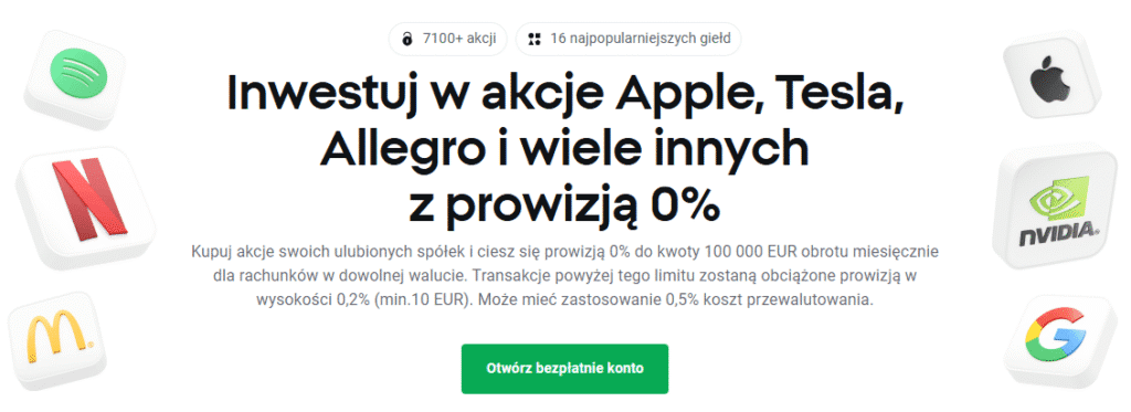 - Brak prowizji od zakupu i sprzedaży akcji oraz ETF-ów do 100 tys. EUR obrotu miesięcznie – płacisz jedynie spread, czyli różnicę między ceną kupna a sprzedaży.