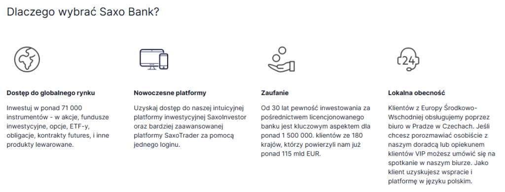 Jedną z wyraźnych zalet Saxo Bank, często podkreślaną w opiniach inwestorów z Polski, jest dostosowanie oferty do lokalnych użytkowników. Platforma inwestycyjna dostępna jest w języku polskim, co znacząco ułatwia korzystanie z zaawansowanych narzędzi, analiz oraz dokumentacji – szczególnie osobom, które nie chcą podejmować decyzji finansowych w obcym języku.