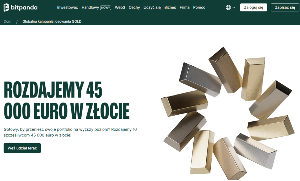 Bitpanda organizuje globalną kampanię promującą inwestycje w złoto, oferując uczestnikom szansę na wygranie atrakcyjnych nagród. Aby wziąć udział, wystarczy zainwestować w złoto za pośrednictwem platformy Bitpanda. Każda inwestycja zwiększa szansę na wygraną, a kampania jest dostępna dla użytkowników na całym świecie – w tym polskich inwestorów.
