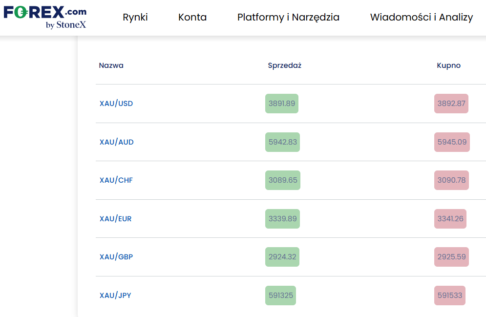 Jeden z brokerów CFD, który oferuje trading z dźwignią na złoto, to Forex.com. To o tyle ciekawa platforma, że udostępnia ona kontrakty CFD nie tylko w wycenie złota do dolara amerykańskiego, ale też do innych walut: