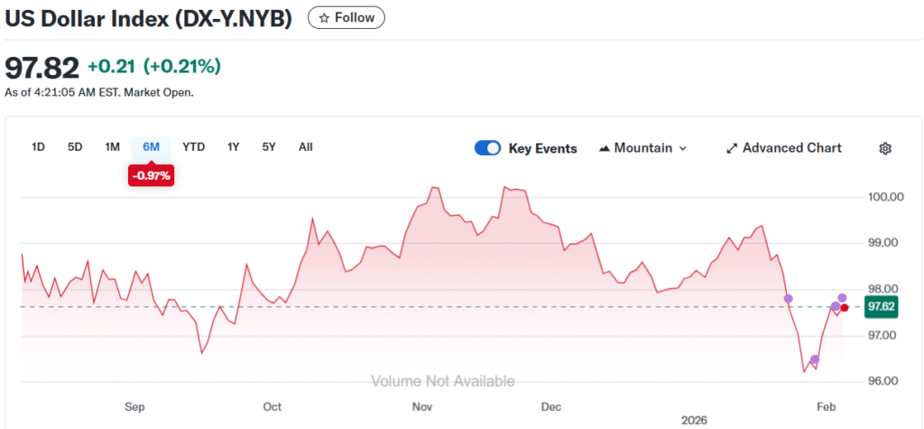 W skrócie: DXY = miernik siły dolara. Im wyższa wartość indeksu, tym mocniejszy dolar w globalnym porównaniu.