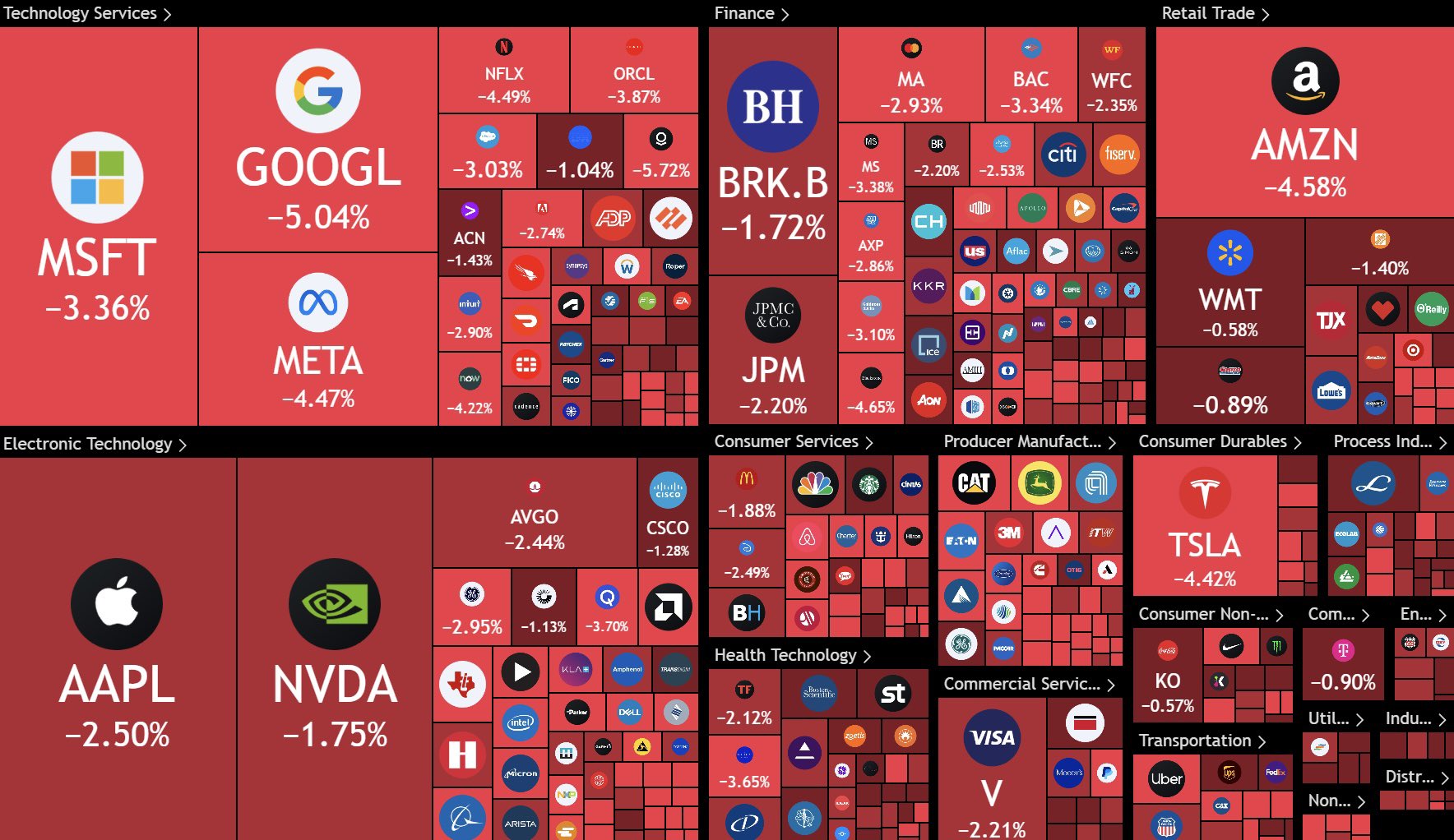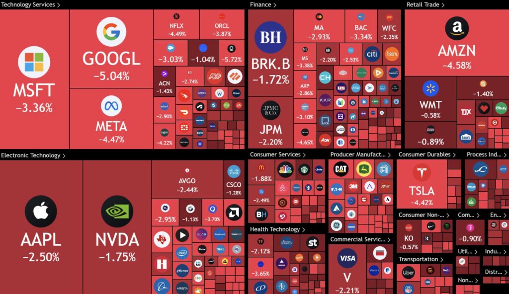 Jeszcze mocniej od S&P 500 ucierpiał indeks Nasdaq, skupiający przede wszystkim spółki technologiczne. Po ogłoszeniu kolejnych ceł Nasdaq Composite stracił 3% w ciągu jednej sesji, podczas gdy Dow Jones zniżkował o ponad 1%, a S&P 500 o 2,2%. Wyprzedaż objęła największych gigantów technologicznych – akcje Nvidii, Apple’a, Amazona czy Microsoftu.