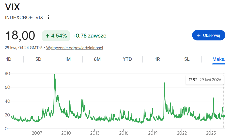 Kluczowe jest słowo „oczekiwana”. VIX nie opisuje tego, co już się wydarzyło na rynku, lecz tego, czego uczestnicy rynku się spodziewają. Jest to więc wskaźnik o charakterze wyprzedzającym – reaguje na nastroje i obawy inwestorów, zanim te znajdą odzwierciedlenie w cenach akcji.