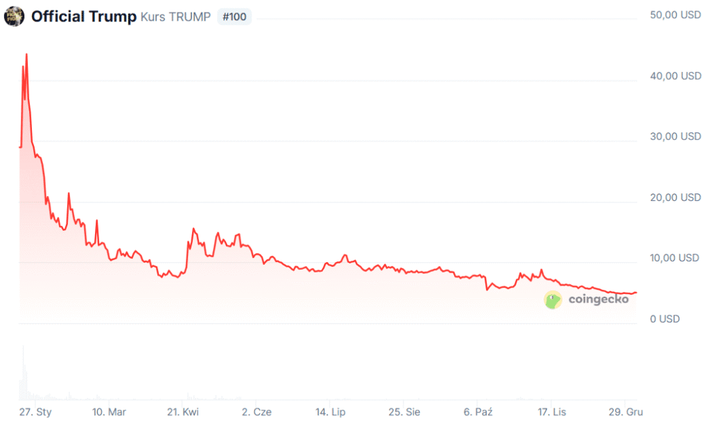 Bardziej wnikliwi analitycy dostrzegli, że sporą podaż tokenów kontroluje środowisko związane z Donaldem Trumpem, a więc osoby, które stworzyły tego coina. Po roku wiemy, że była to manipulacja. Od szczytu kryptowaluta TRUMP spadła już ponad 80%. Wystarczy spojrzeć na wykres, żeby zauważyć, jak duży był to spadek.