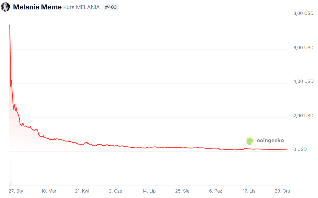 Gdy jeszcze nie umilkły echa kontrowersyjnego debiutu kryptowaluty TRUMP – to samo środowisko wypuściło kolejny projekt, czyli MELANIA. Oficjalnie była to kryptowaluta pierwszej damy USA. Mechanika była podobna, ale spadek jeszcze boleśniejszy.