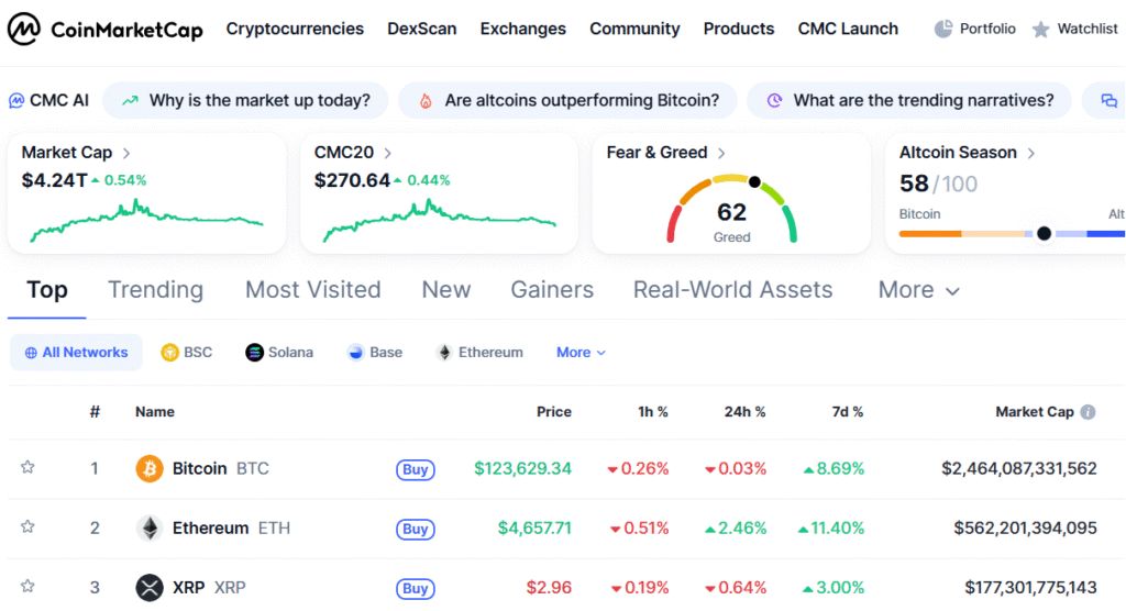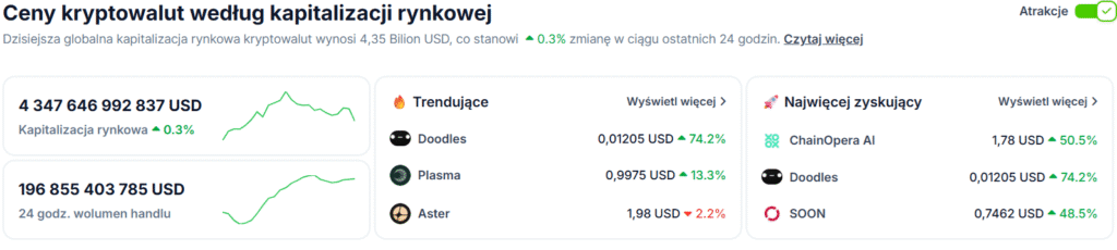 Platformy CoinGecko i CoinMarketCap to serwisy służące do śledzenia danych z rynku kryptowalut. Zbierają one informacje z setek giełd i prezentują w czasie rzeczywistym kursy tysięcy kryptowalut, ich kapitalizację rynkową, wolumen obrotu, podaż oraz zmiany cen w różnych przedziałach czasowych.