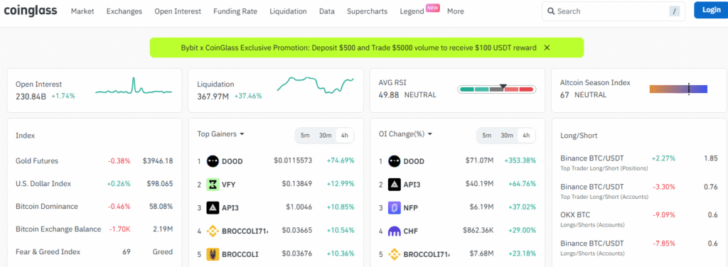 CoinGlass to platforma analityczna specjalizująca się w rynku instrumentów pochodnych kryptowalut (futures, perpetual contracts). Agreguje dane z wielu giełd i udostępnia wskaźniki takie jak likwidacje, open interest, funding rate, mapy likwidacji i wiele innych. Ponadto platforma ta zbiera dane o amerykańskich ETF-ach na kryptowaluty. Od 2024 roku fundusze na Bitcoina i Ethereum znacząco zmieniły dynamikę rynku, a statystyki związane z tymi instrumentami stały się ważnym indykatorem.