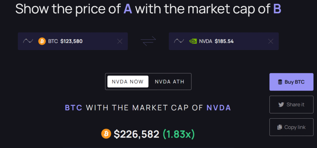 To platforma internetowa, która pozwala użytkownikom porównywać wartości rynkowe (kapitalizację) między różnymi kryptowalutami czy innymi aktywami giełdowymi. Dzięki temu szybko oszacujesz, jak wyglądałaby cena danego aktywa, gdyby miało kapitalizację innego aktywa np. ile musiałby kosztować Bitcoin, żeby przebić kapitalizację Nvidia?