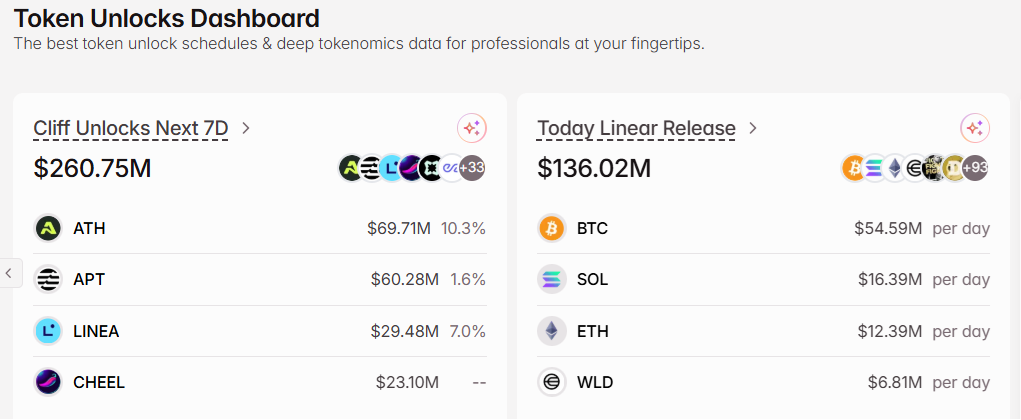 Tokenomię – harmonogramy odblokowywania tokenów (token unlocks), alokacje, tokenomics projektów.
